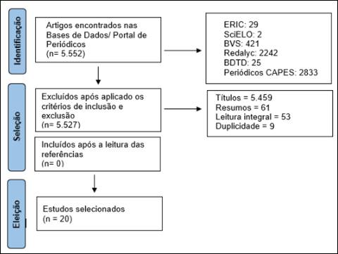 Após a triagem dos materiais, aplicando os critérios de inclusão e exclusão, foram selecionados 20 estudos para compor essa revisão. Na Figura 1, pode-se acompanhar o processo de seleção.